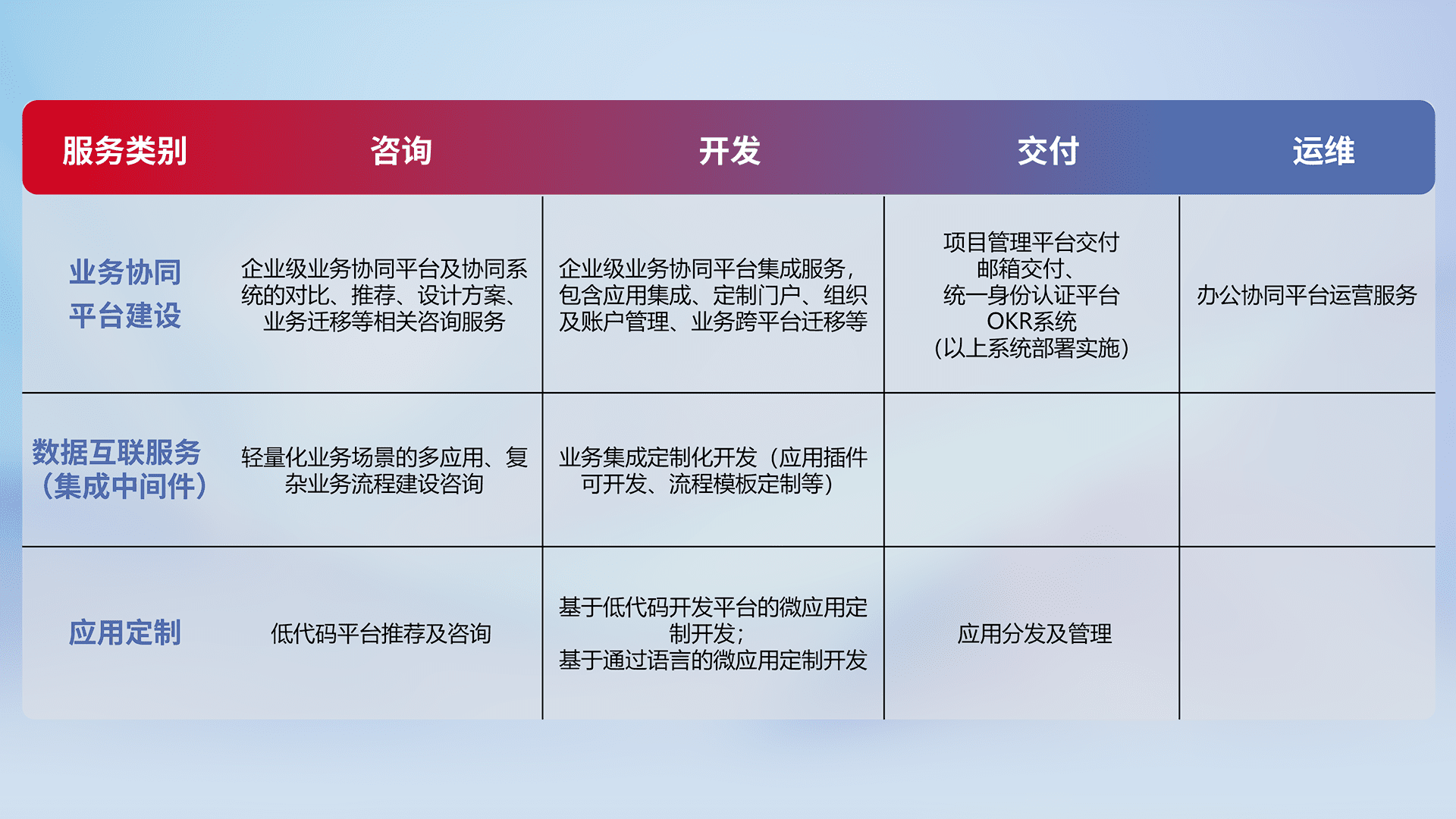针对钉钉、、、、企微、、IDaas等平台级产品提供产品的规划、、、、方案、、、交付、、定制化开发等服务,,,,实现如统一协同办公、、智能客户服务、、、混合会议管理、、智能数据查询、、、等业务场景,,实现数字化转型。。。